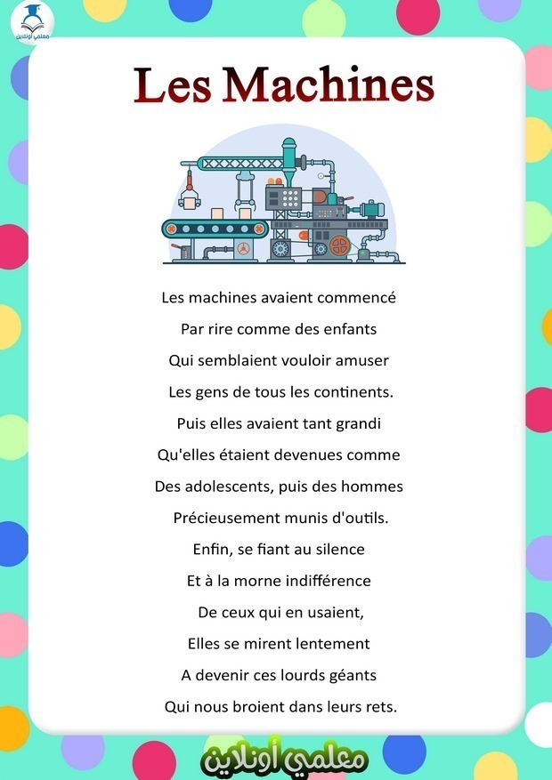 كما عودكم موقع معلمي أونلاين بتوفير كل المراجع و الملفات منها المحفوظات و الأناشيد باللغة العربية. يوفر لكم أيضا محفوظات باللغة الفرنسية لفائدة تلاميذ السنة السادسة ابتدائي. في هذا المقال سوف نقدم لكم محفوظات Les Machines مكتوبة في حلة جديدة و في العديد من الصيغ PDF WORD