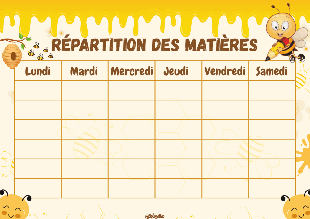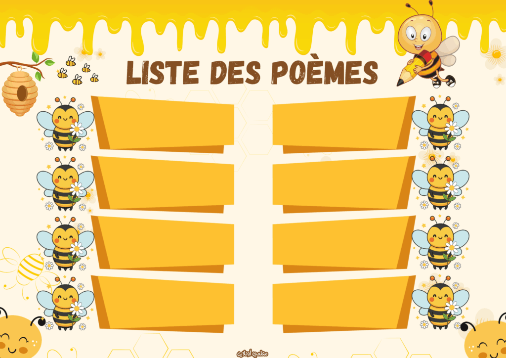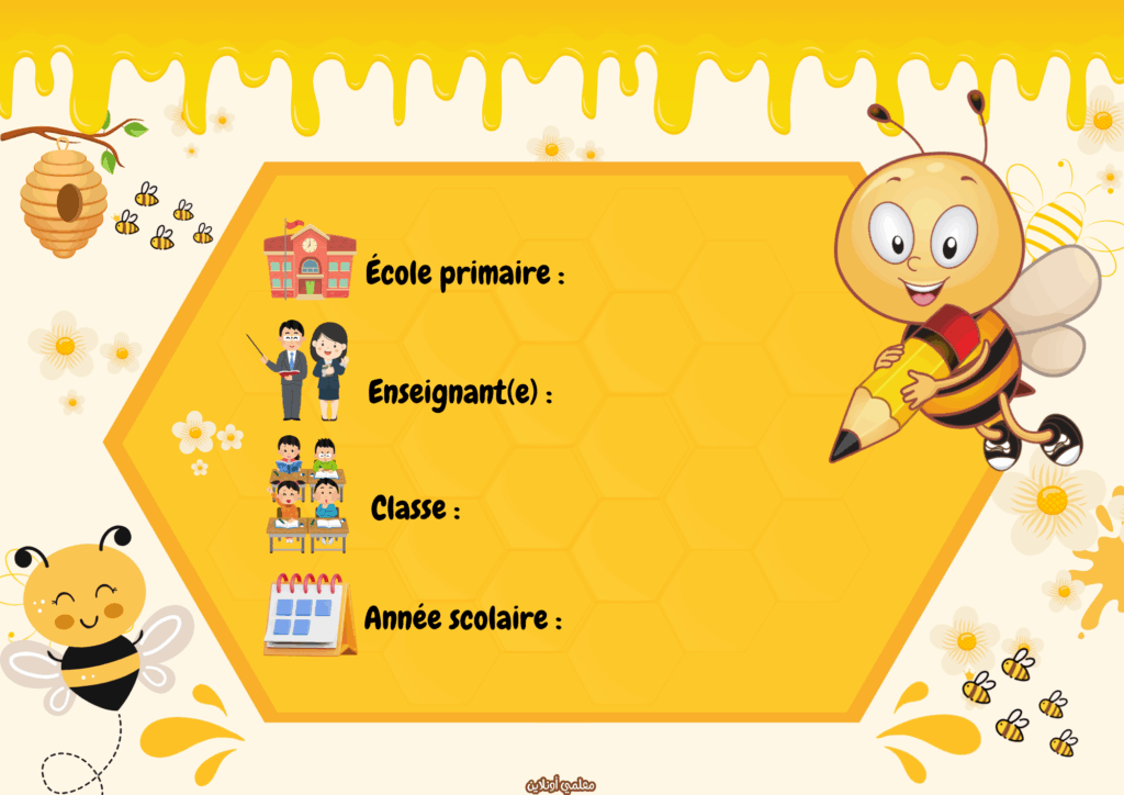 يقدّم موقع معلمي أونلاين نسخة جديدة ومميزة من المعلقات الرسمية باللغة الفرنسية – نسخة نحول، بتصميم أنيق ومبهج مستوحى من عالم النحل اللطيف 🐝.