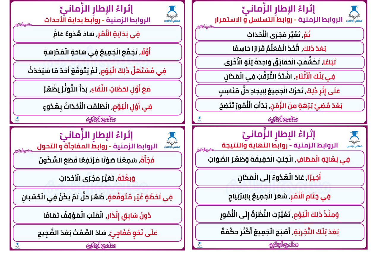 تضمّ المعلّقات مجموعة من الروابط الزمنية المصنّفة حسب وظائفها: روابط البداية، وروابط التسلسل، وروابط المفاجأة، وروابط النهاية. أدرجنا أمثلة مشكولة ومدقّقة لغويًا لتسهيل الفهم والتوظيف أثناء الكتابة. كل المعلقات مجمعة في ملف PDF عالي الجودة جاهز للطباعة و التحميل المباشر من جدول المرفقات أسفل المقال.